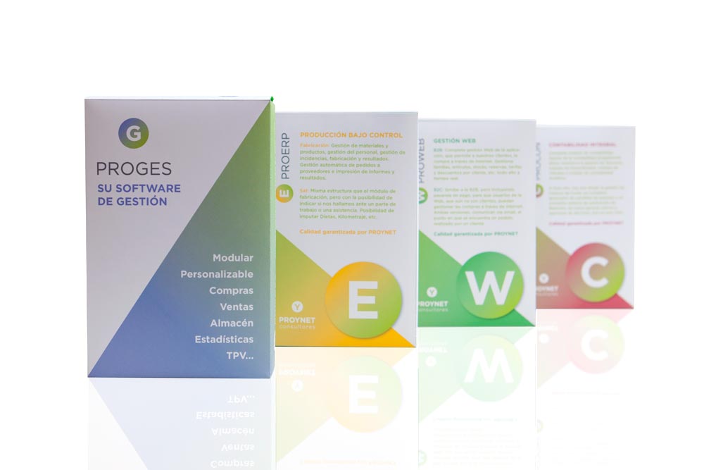 Disseny de col·lecció de caixes per als programes de gestió i contabilitat desenvolupats per Proynet Consultores: Proges, Procon, Proerp i Proweb.